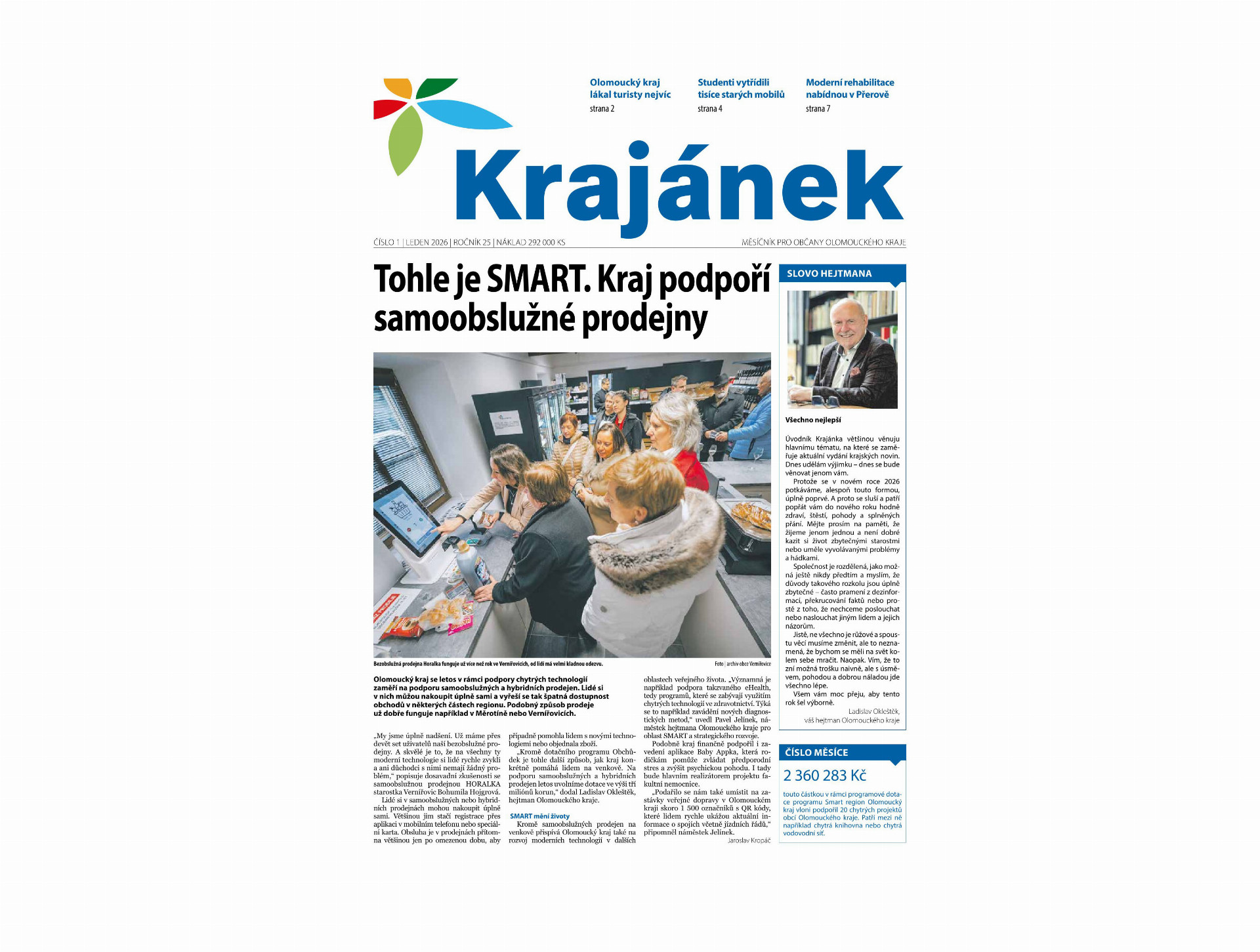 V aktuálním čísle se také dozvíte, kde se v kraji narodilo první miminko roku 2026, jaký úspěch měla soutěž Odlož mobil ve školách nebo jak velký má Olomoucký kraj úspěch z hlediska cestovního ruchu.