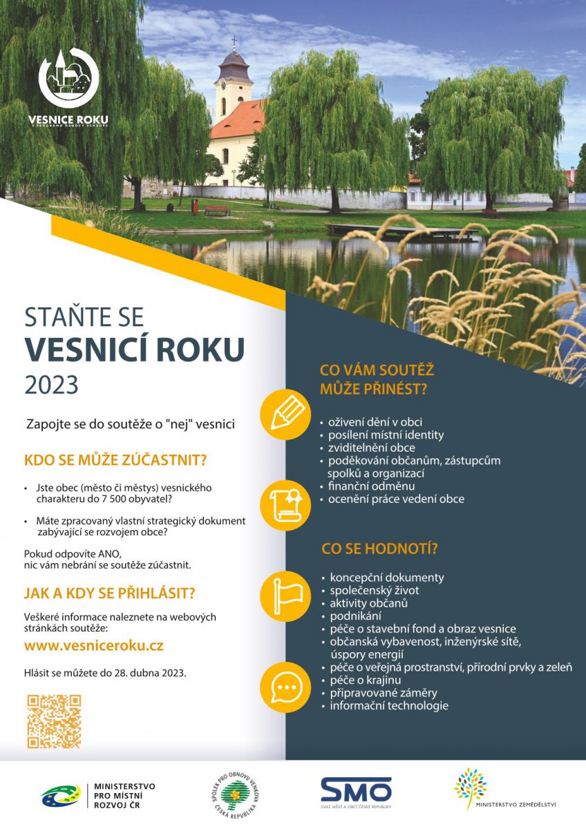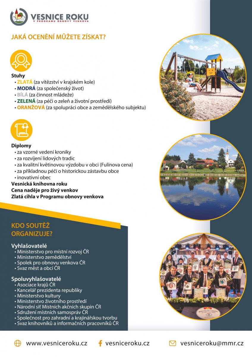 Také letos se obce mohou hlásit do soutěže Vesnice roku. Právě odstartoval její už sedmadvacátý ročník a přihlášky se podávají do 28. dubna. Smyslem je ocenit vesnice, které jsou činorodé a hezky pečují o své obyvatele i okolí. Na vítěze čeká zajímavá finanční odměna.