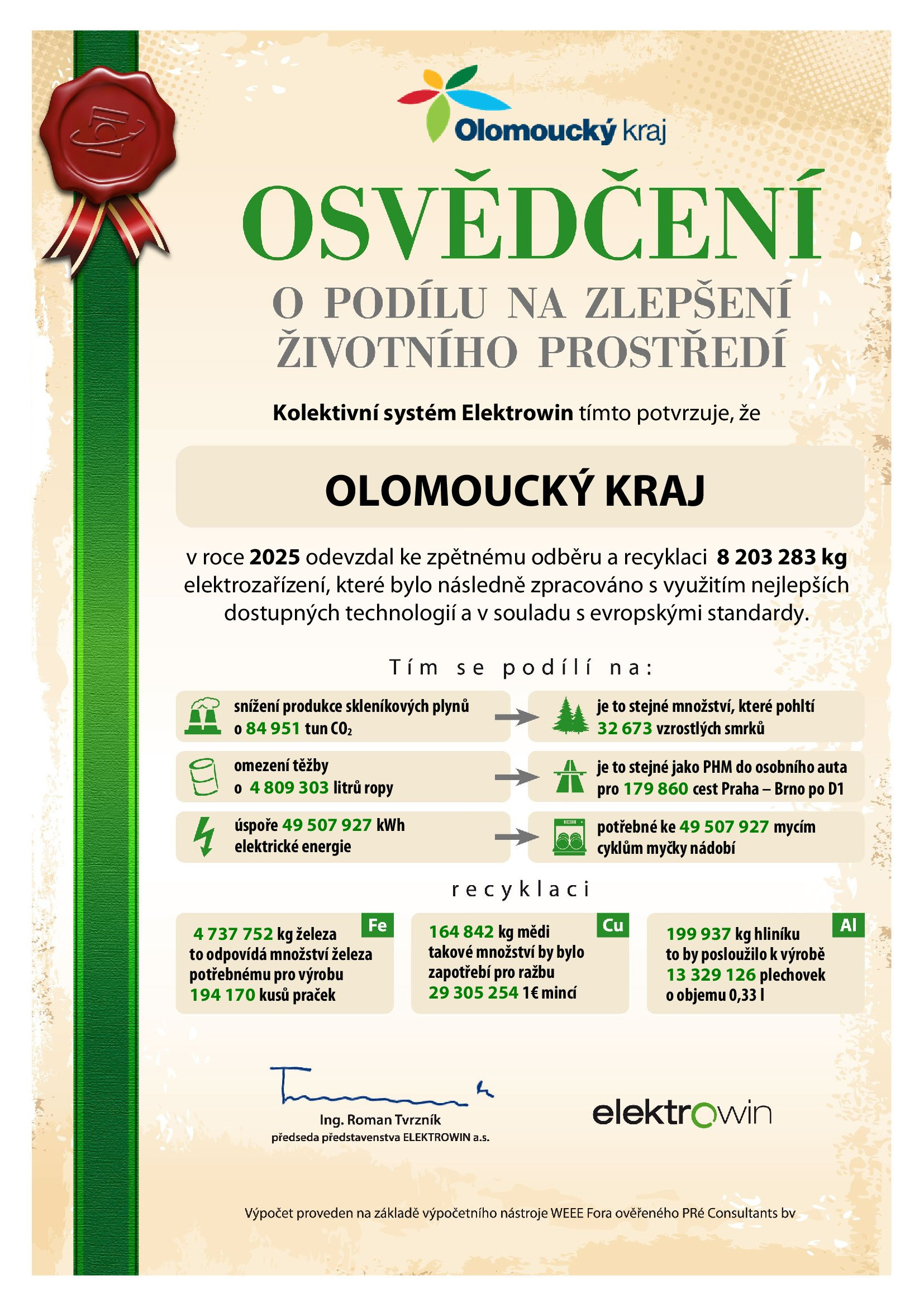 „Velmi mě těší, že se obyvatelé Olomouckého kraje díky své zodpovědnosti a ekologickému smýšlení dostali na pomyslnou zlatou příčku v celorepublikovém srovnání. Odevzdalo se více než 8 200 tun elektroodpadu, to je rozhodně úctyhodné množství,“ řekla Irena Blažková, náměstkyně hejtmana pro životní prostředí, odpady a zemědělství.
