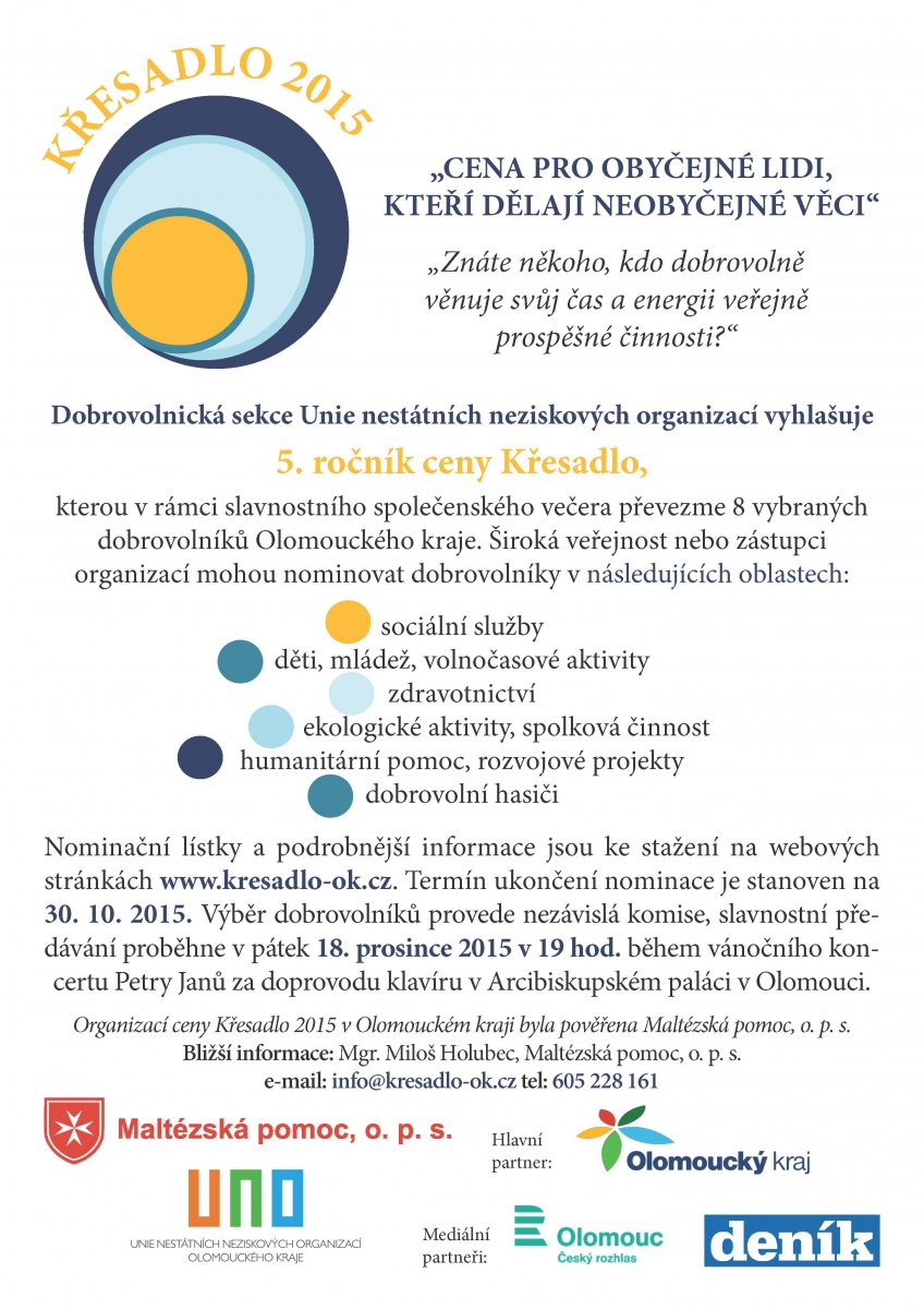 Tento rok se v Olomouckém kraji koná již pátý ročník udílení cen dobrovolníkům Křesadlo 2015. Jak zní motto akce, jedná se o „cenu pro obyčejné lidi, kteří dělají neobyčejné věci“.