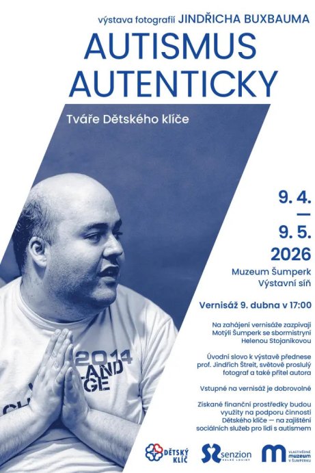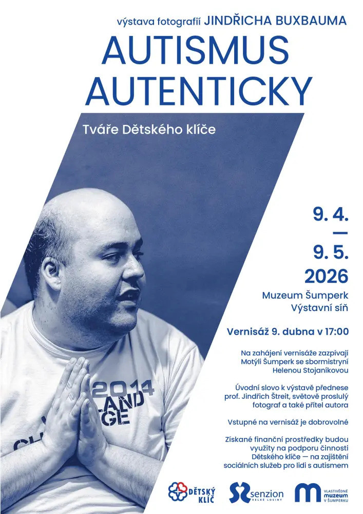 V rámci osvětové kampaně Rozsviťme se modře 2026 u příležitosti Světového dne porozumění autismu vás Dětský klíč Šumperk srdečně zve na vernisáž výstavy fotografií Jindřicha Buxbauma AUTISMUS AUTENTICKY – Tváře Dětského klíče, která se koná ve Výstavní síni šumperského muzea ve čtvrtek 9. 4. 2026 v 17 hodin. Na vernisáži zazpívají Motýli Šumperk. Úvodní slovo k výstavě přednese prof. Jindřich Štreit, světově proslulý fotograf a také přítel autora. Vstupné na vernisáž je dobrovolné. Získané finanční prostředky budou využity na podporu činnosti Dětského klíče – na zajištění sociálních služeb pro lidi s autismem. Lidé s touto diagnózou mají problém s navázáním sociálních vztahů a s komunikací. Jindřichu Buxbaumovi se podařilo získat jejich důvěru, a tak fotografie z tohoto souboru vynikají svou autentičností a přirozeností. Výstava potrvá do 9. 5. 2026.