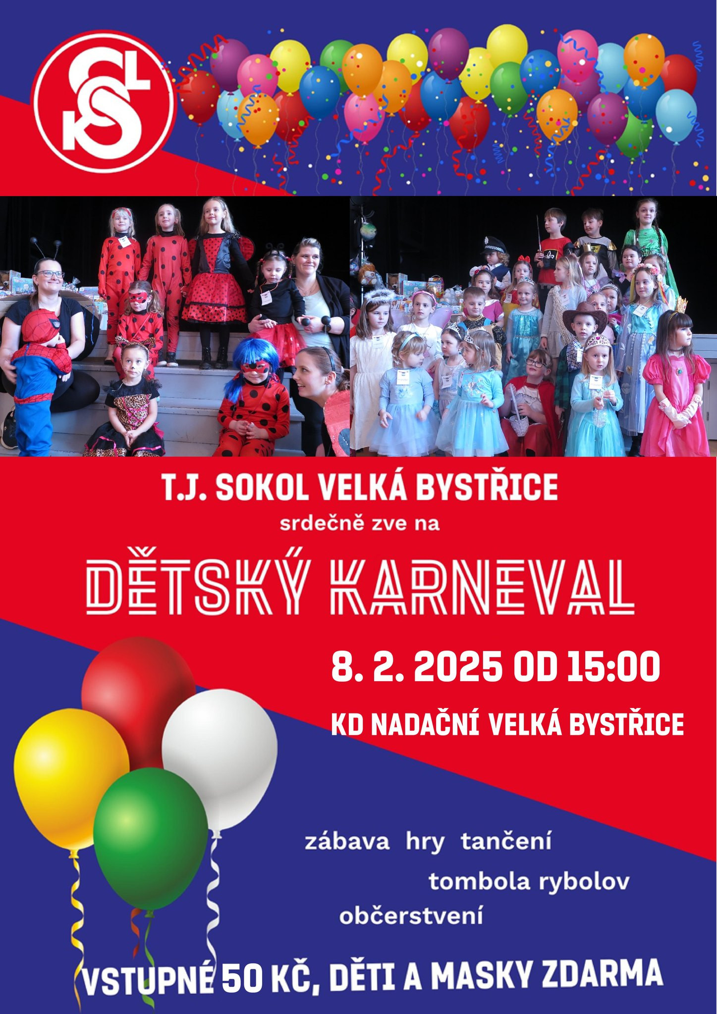 TJ Sokol Velká Bystřice zve děti, rodiče i prarodiče na odpoledne plné tance, her a zábavy. Tombola, rybolov, bohaté občerstvení. Vstupné 50 Kč, děti a masky ZDARMA.