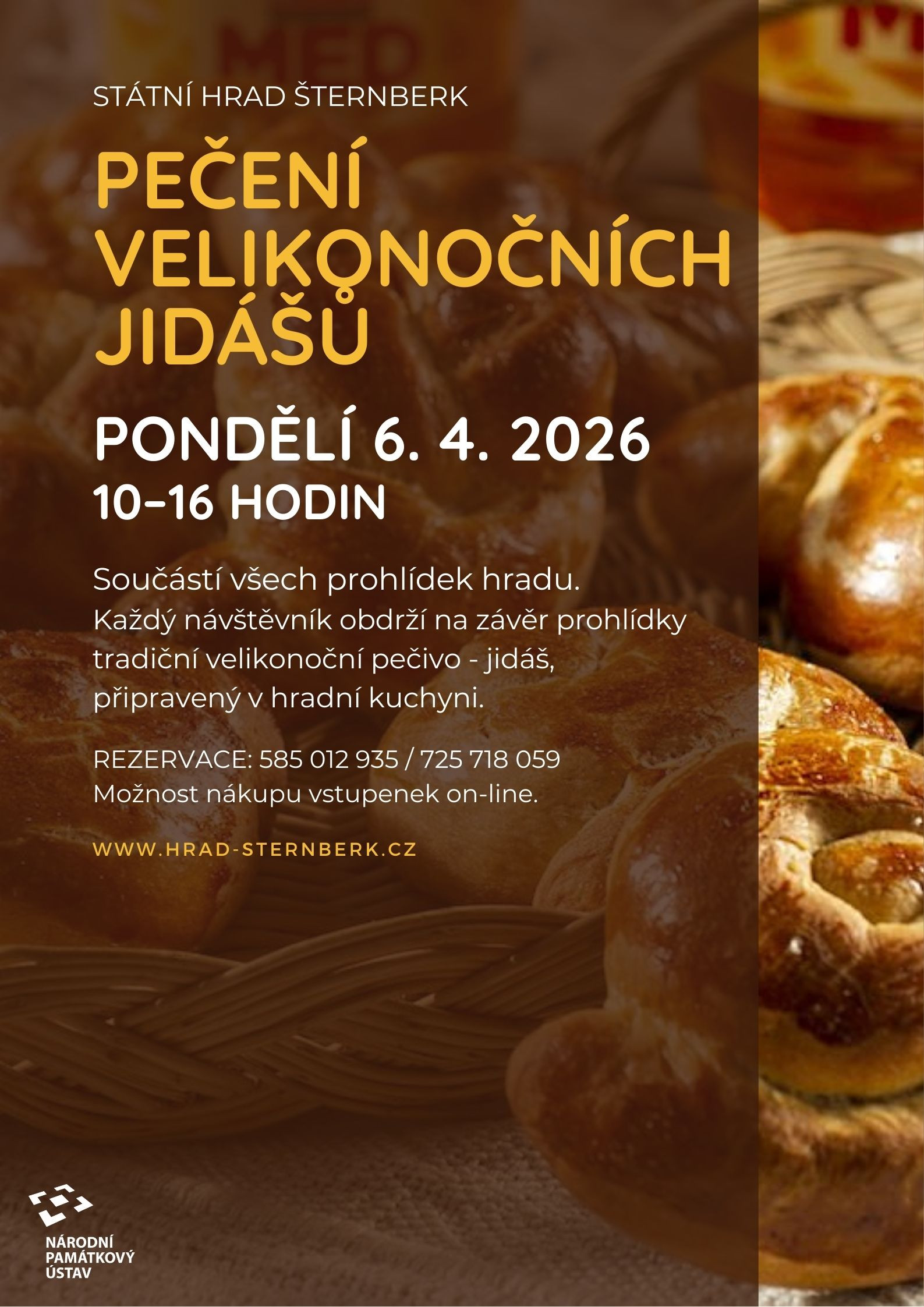 V pondělí 6. 4. 2025 připravujeme pro všechny návštěvníky malé, ale chutné překvapení. Přímo v historických kachlových kamnech, nacházejících se v Liechtensteinské kuchyni, budeme péct tradiční velikonoční pochoutky – jidáše. A každý návštěvník na závěr prohlídky dostane jeden kousek jako poděkování za návštěvu našeho hradu. Zda si hotový jidáš odnesete domů nebo sníte přímo na místě, to už necháme na vás. Ochutnávka bude součástí všech pondělních prohlídek hradu, které v Liechtensteinské kuchyni tradičně končí. Těšíme se na vaši návštěvu.
