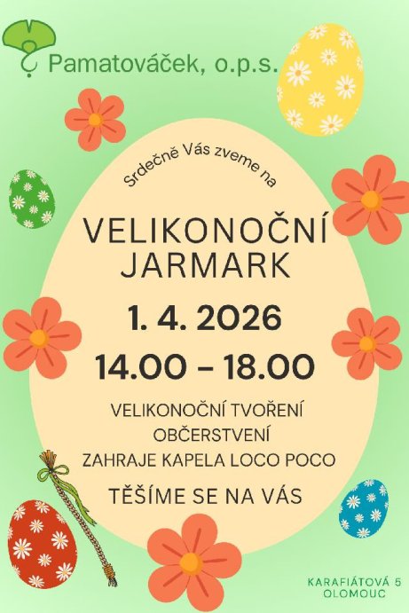 Organizace Pamatováček, o.p.s. zve veřejnost na velikonoční jarmark, který se uskuteční ve středu 1. dubna 2026 od 14 do 18 hodin v prostorách denního stacionáře na adrese Karafiátová 5 v Olomouci. Akce bude zároveň první veřejnou událostí pod vedením nové ředitelky Dominiky Dolákové.