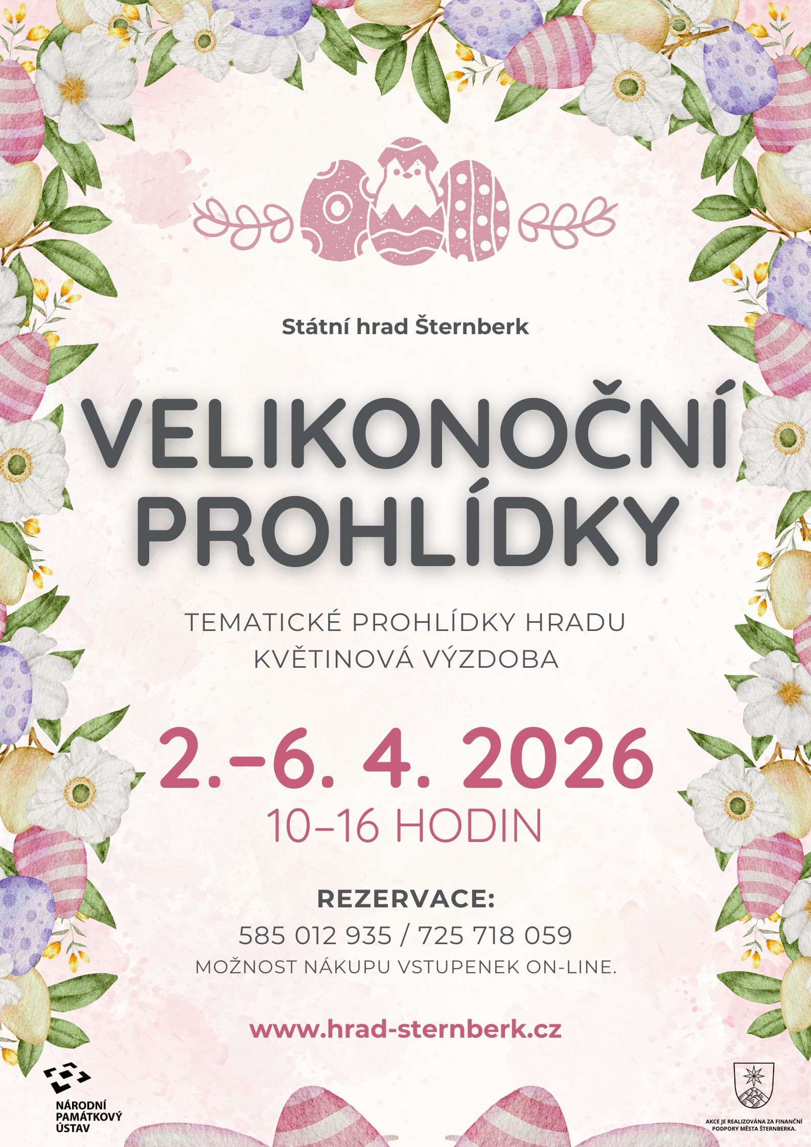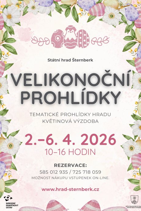 Velikonoční prohlídky hradu Šternberk bude možné navštívit od čtvrtka 2. 4. do neděle 5. 4. 2026 vždy od 10 do 16 hodin. Provázet budeme prvním patrem hradu, jehož interiéry doplní velikonoční výzdoba a instalace řezaných květin. Výklad průvodců bude rozšířen a seznámí návštěvníky nejen s historií hradu Šternberk, ale rovněž s historií Velikonoc. Návštěvníci se dozvědí zajímavé informace týkající se svátků jara.