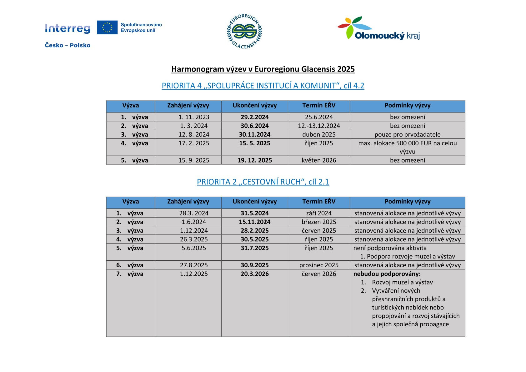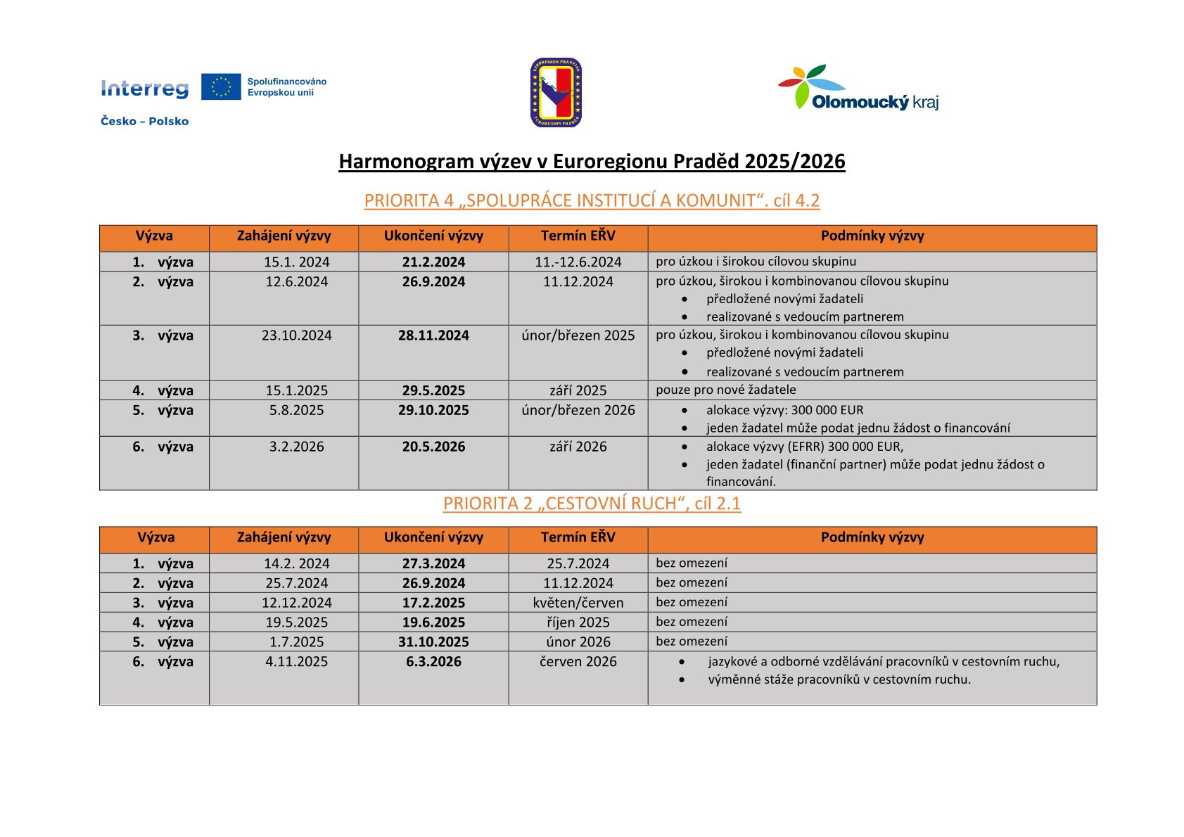 Harmonogram výzev: